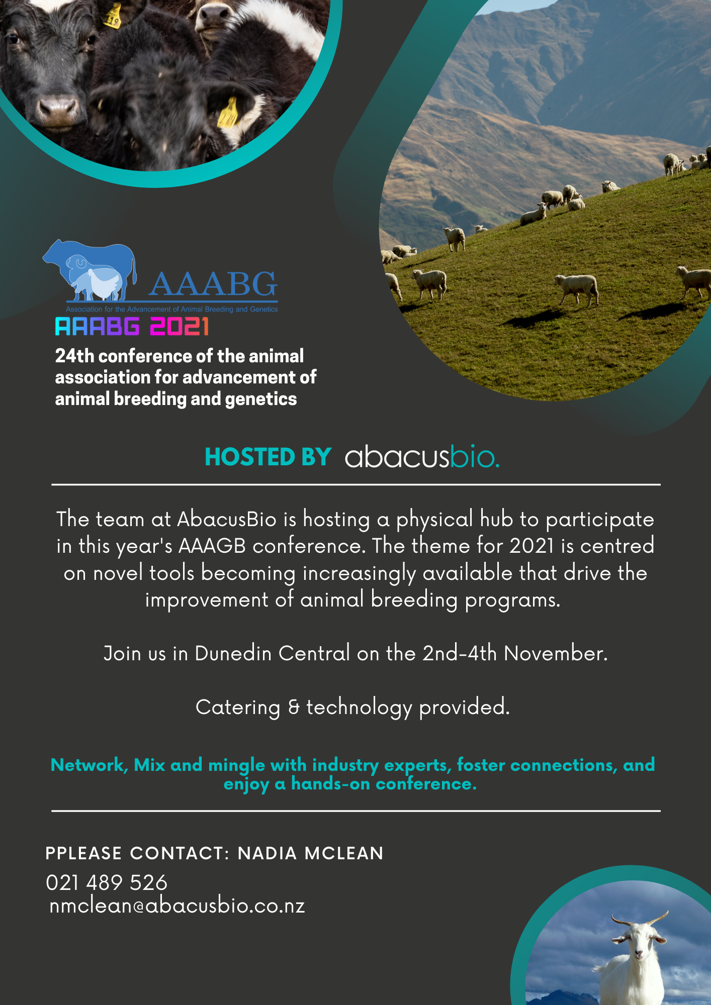 The theme of the 2021 24th AAABG conference is “Widening the range of technologies used in animal breeding and genetics”, and as always, the meeting will focus on economically important, domesticated animal species. We are delighted to have 5 exemplary plenary speakers covering topics within this theme including Sonja Dominik, Mark Hutchinson, John McEwan, Suzanne Rowe and Professor Naomi Wray. An overview of plenary speakers can be found here.